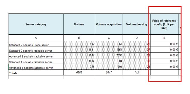 In the financial evaluation sheet, the Volume is predefined. So, the challenge of the vendor and of the tenderer is “simple”: determine the prices of the configurations that will determine the lowest cost of the tender (Fig 2).