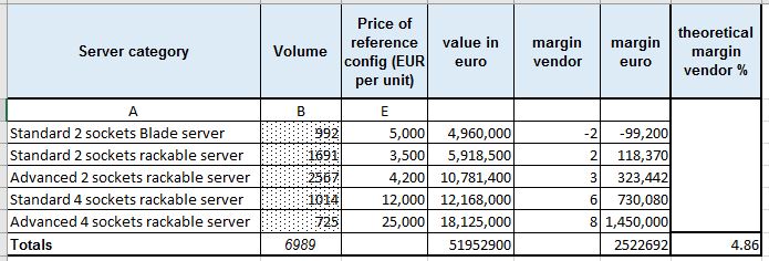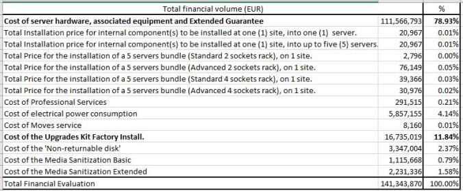In this kind of tender the price of the hardware configurations has a very high importance. A simple and quick simulation on the financial evaluation sheet (using end user price list for hardware and services) shows that the weight of the hardware component is close to 90% (Fig 1).